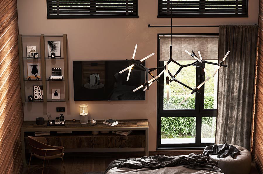 В оформлении спальни использованы приглушённые тона, которые способствуют спокойному сну и отдыху. При этом комнату в любой момент можно наполнить естественным светом — благодаря большому панорамному окну.