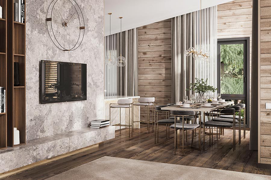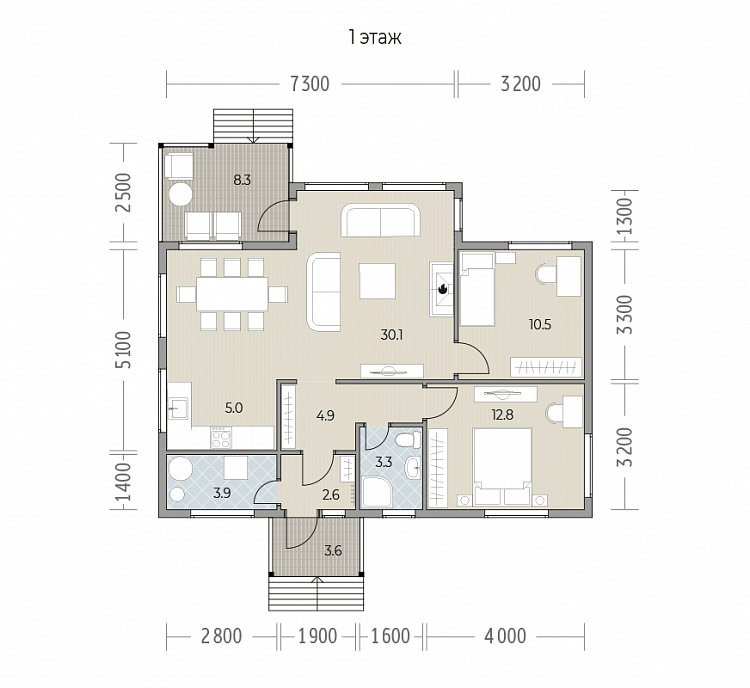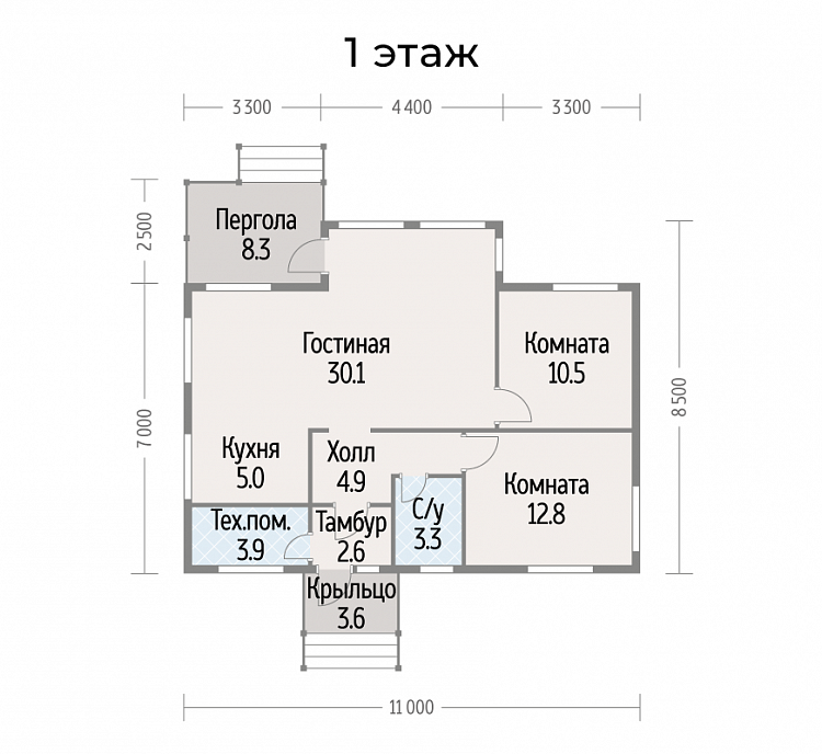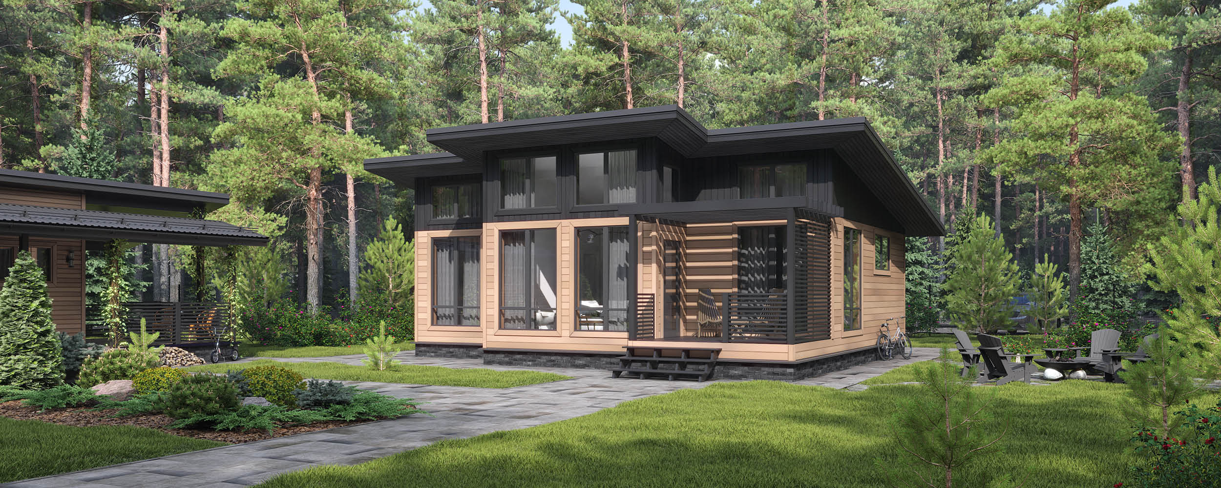 Гостиная Г-образной формы находится в одном пространстве со светлой кухней. В зависимости от проекта, в коттеджах от двух до четырёх изолированных комнат, которые можно использовать под спальни, рабочий кабинет, детскую. В базовую комплектацию входит пергола и техническое помещение.