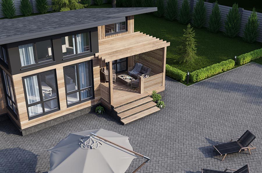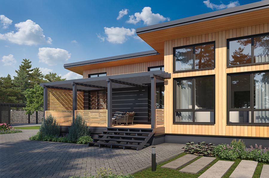 Фактура клеёного бруса, кровля из металлочерепицы и отделка цоколя придадут дому привлекательный внешний вид.