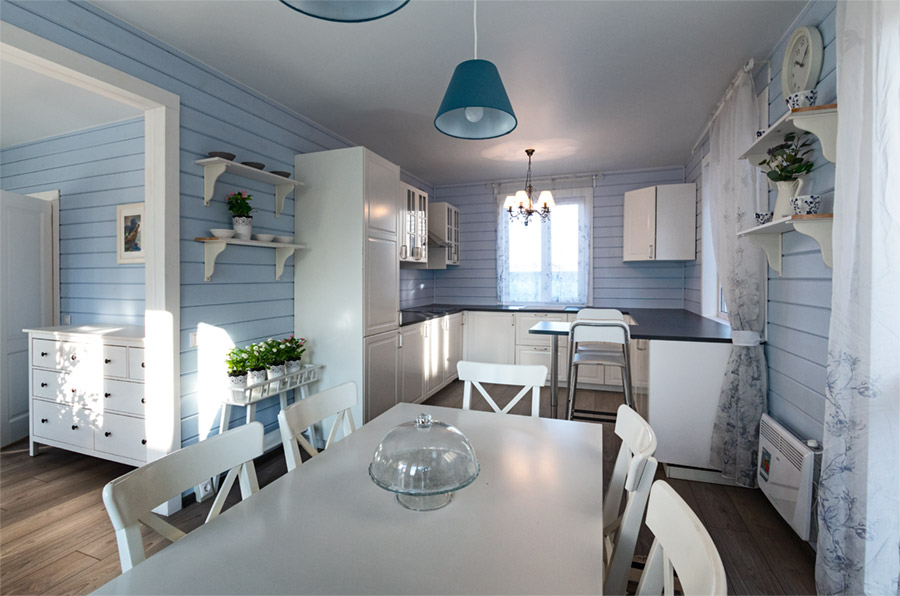 Белые матовые фасады с классической фрезеровкой гармонично сочетаются с деревянной отделкой и придают интерьеру современный облик. Гарнитур может быть прямым или Г-образным в зависимости от планировки помещения.