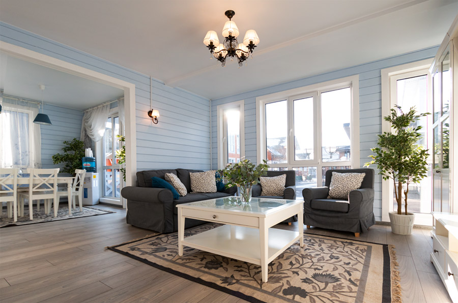 Коттедж можно заказать в варианте со вторым светом — гостиная высотой в два этажа будет иметь дополнительный ряд панорамных окон. Помимо хорошей освещённости, здесь ещё и отличная акустика — можно устраивать просмотры фильмов, прямо как в кинотеатре.