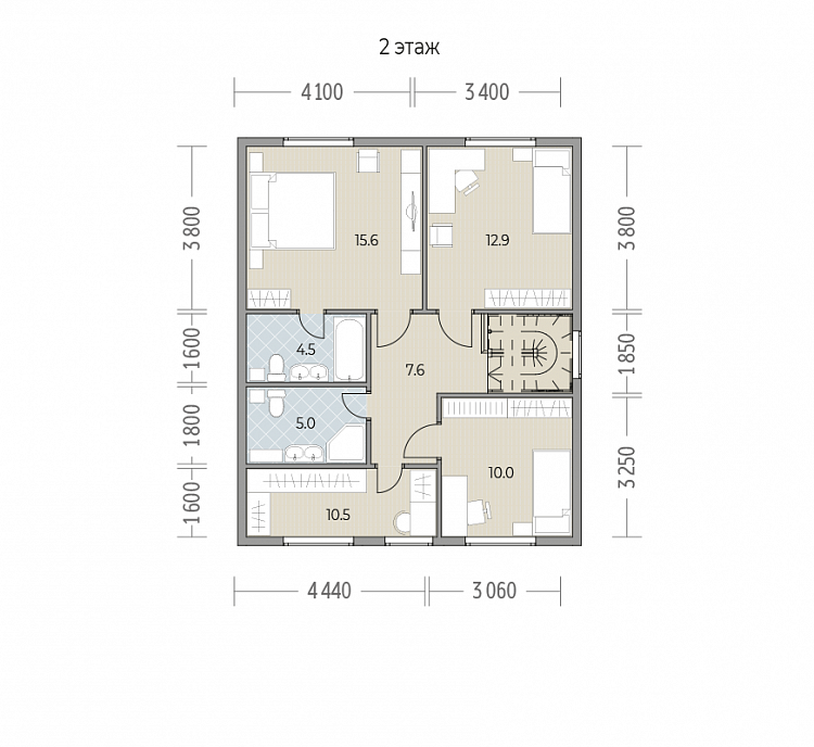 В планировке предусмотрены две гардеробные. Самая просторная — гардеробная второго этажа (10,5 кв. метра). В ней можно организовать удобное хранение вещей каждого члена семьи.