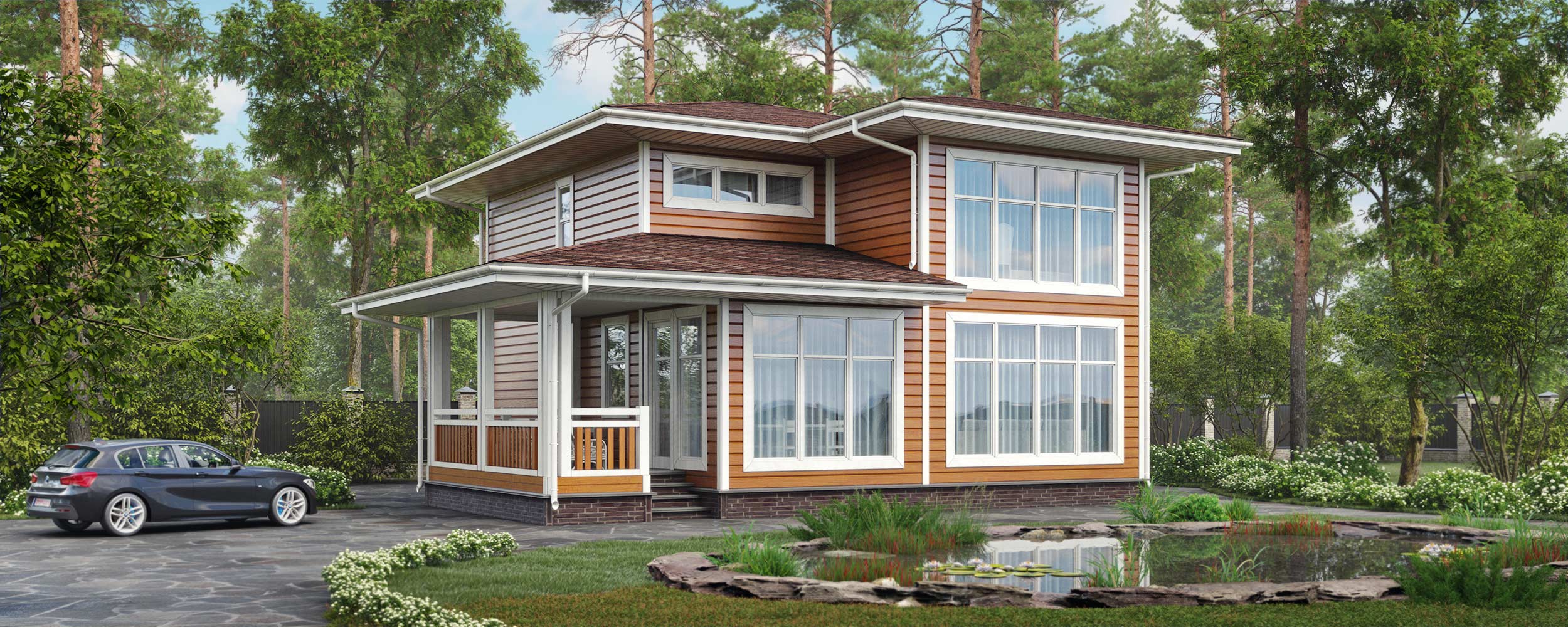 Фактура клеёного бруса, кровля из металлочерепицы и отделка цоколя придадут дому привлекательный внешний вид.