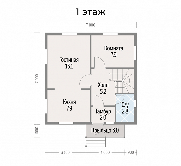 Лестница:двухмаршевая, поворотная с забежными ступенями
