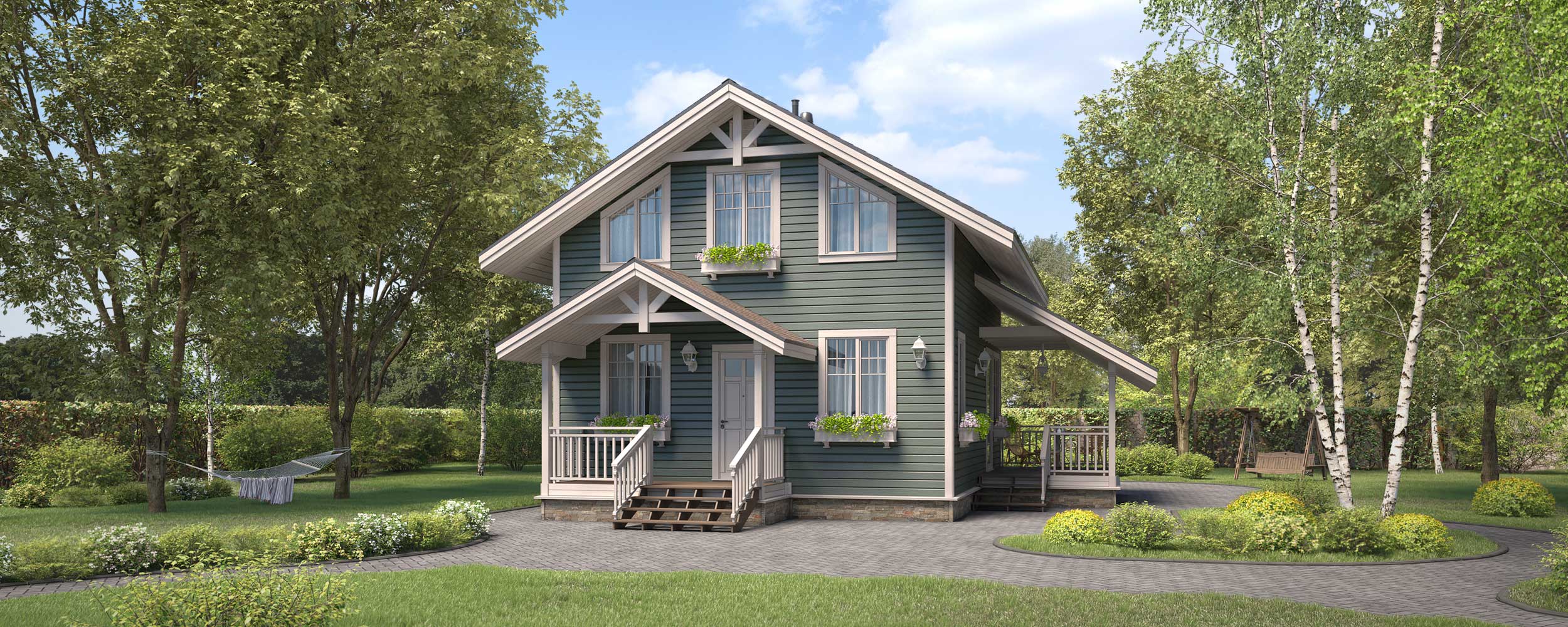 Фактура клеёного бруса, кровля из металлочерепицы и отделка цоколя придадут дому привлекательный внешний вид.