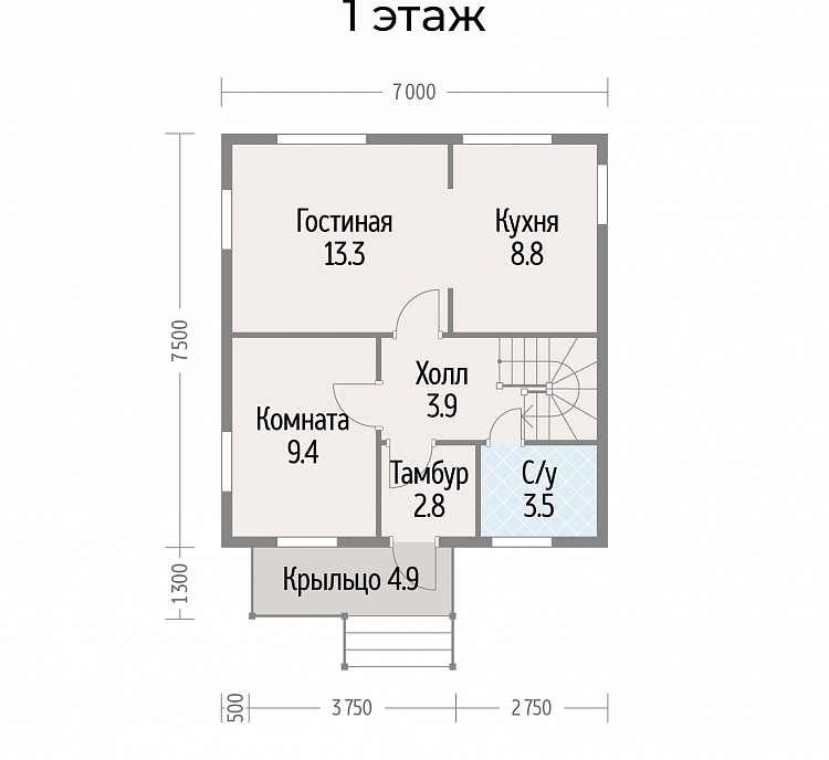 Особенности серии: увеличенный тёплый тамбур и дополнительные помещения — гардеробные и котельная.